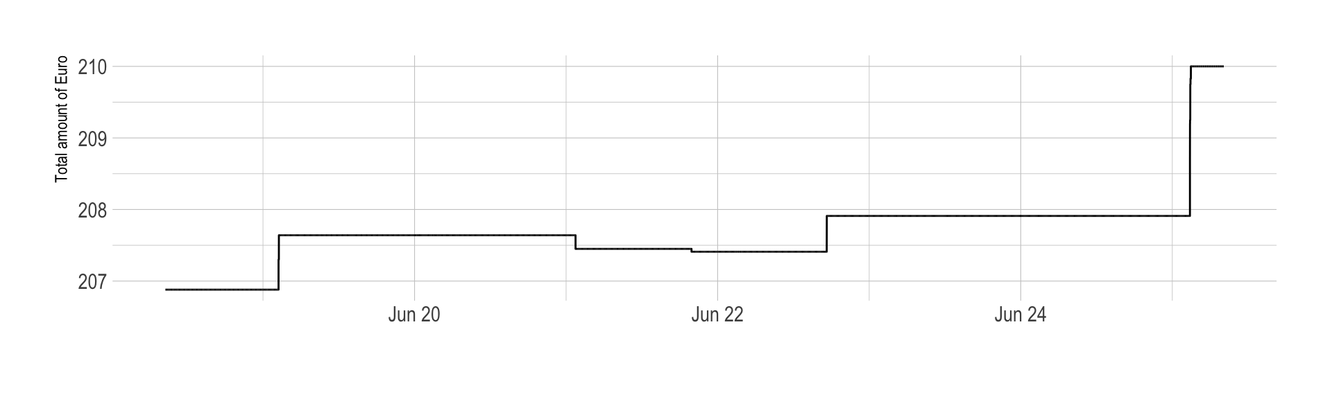 At each transaction the bot is supposed to make a tiny margin, thus the total quantity of euro is suppose to slowly increase. Indeed, the process started with 206.88 and finished with 210, what is a gain of 3.12.